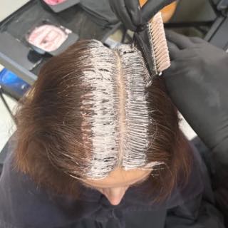 カラーによる刺激や不快感が出にくいよう、頭皮への負担を考慮した、薬剤を頭皮につけない塗布方法「ゼロテク」。頭皮への刺激を考えた薬剤選定。